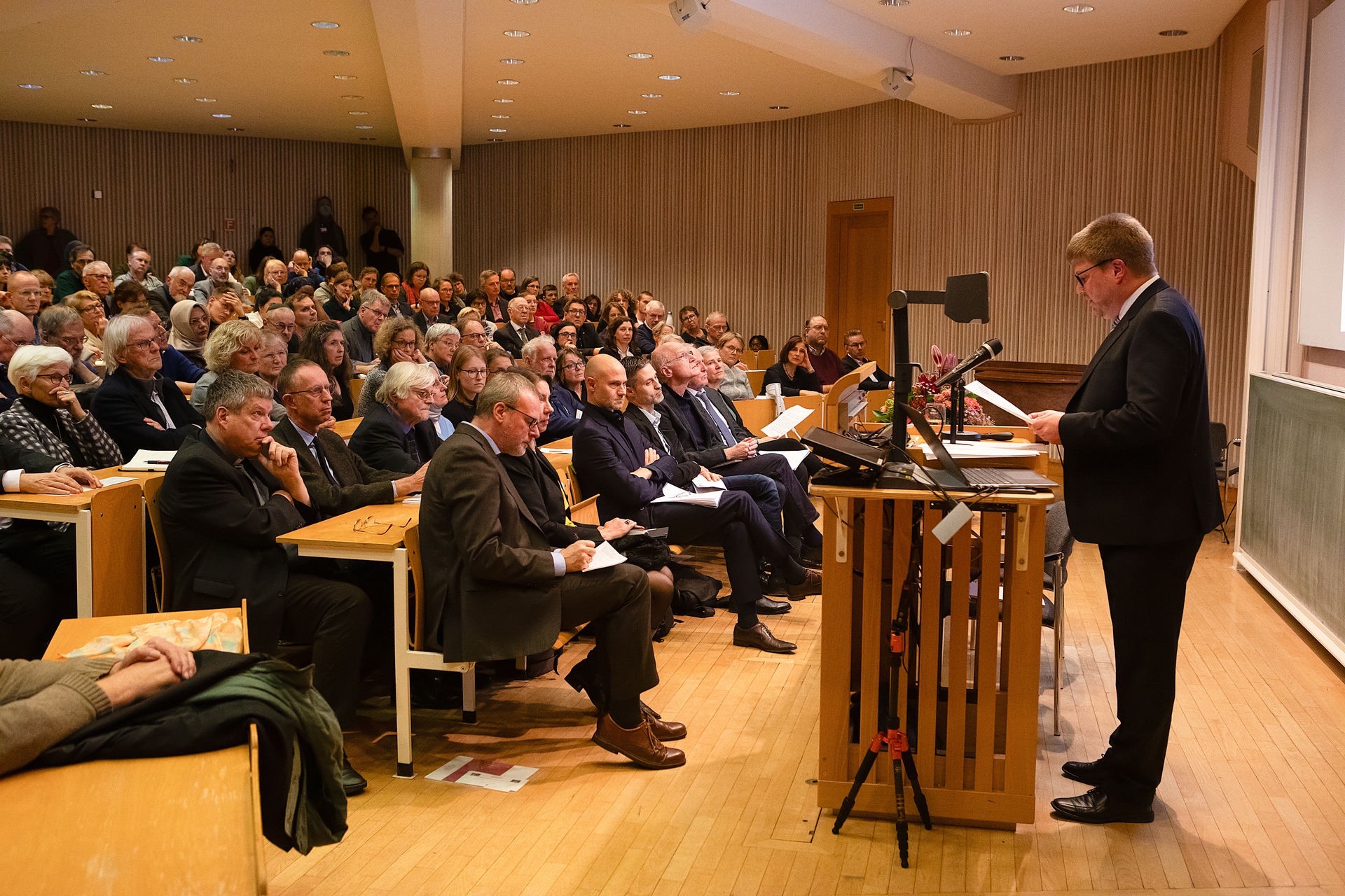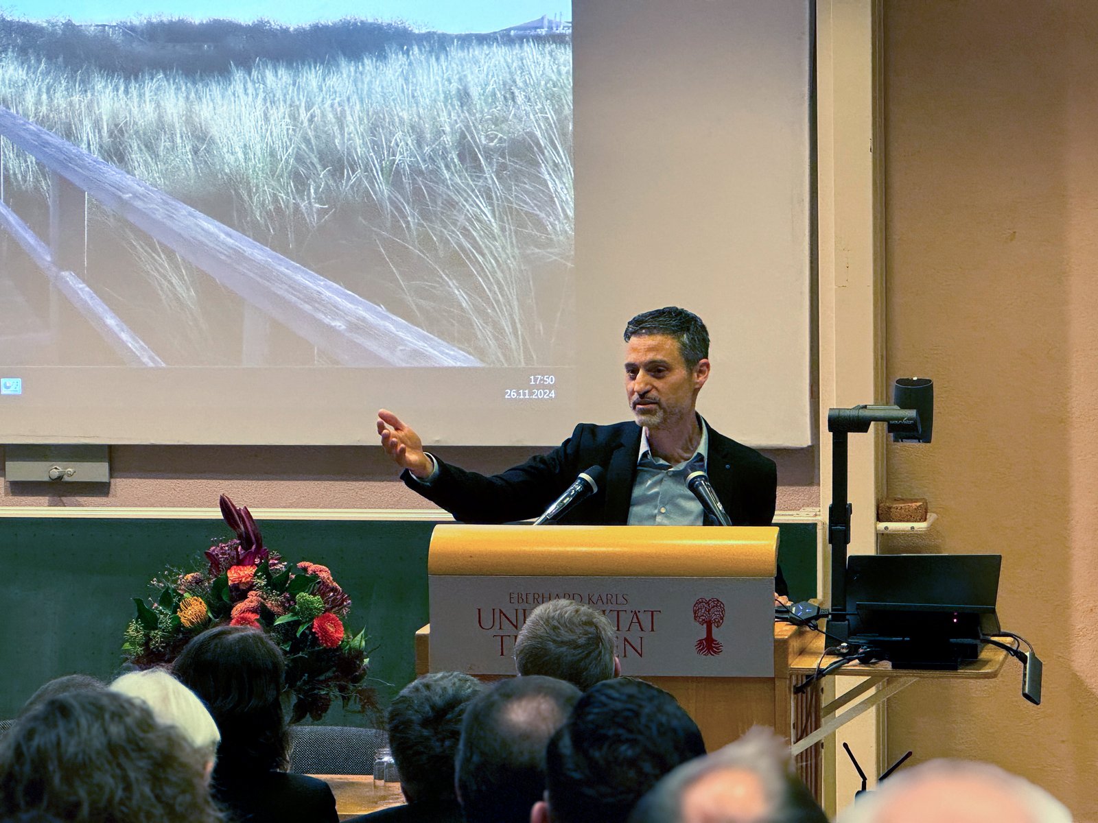 „Humanität als Praxis“ lautete auch der Titel des Vortrags, mit dem Omri Boehm, der israelische, in New York lehrende Philosoph, den ihm zugedachten Ethik-Preis an der Universität Tübingen entgegennahm. Benannt nach dem großen Tübinger Theologen und Erneuerer der katholischen Morallehre, Prof. Alfons Auer (1915-2005), wird er alle zwei Jahre von der Katholisch-Theologischen Fakultät und der Akademie der Diözese Rottenburg-Stuttgart verliehen, deren programmatisch denkender Gründungsdirektor Alfons Auer war. Zur Preisverleihung kamen am Dienstag, 26.11.2024, mehrere hundert Menschen ins Tübinger Theologicum. Des Andrangs wegen wurde die Zeremonie kurzfristig auch noch in einen weiteren Hörsaal übertragen.